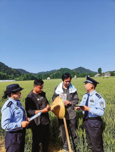 2024年5月20日,洛南縣公安局古城派出所所長王振全(右一)帶領(lǐng)社區(qū)民警深入轄區(qū)何村,開展主動警務(wù)工作,向正在田間勞作的群眾宣講反詐知識,講解識別電信詐騙的方法。 (本報通訊員 李重立 攝)