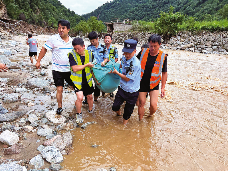 2024年7月30日,柞水縣曹坪鎮(zhèn)中坪社區(qū)七組一老人吳某某在返家過河時不慎被洪水沖倒,曹坪派出所民輔警及村干部一起用被單裹著受傷老人蹚過金井河,并緊急聯(lián)系救護車將其送醫(yī)治療。(本報通訊員 廖一凡 攝)