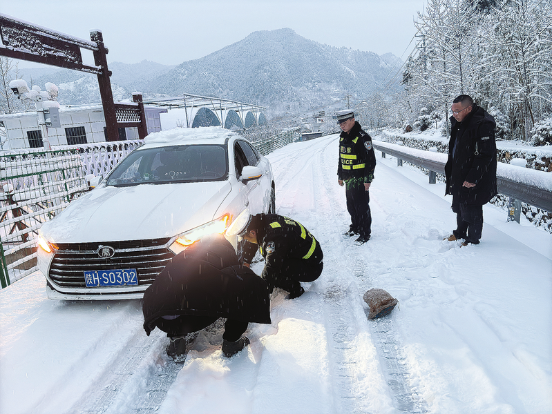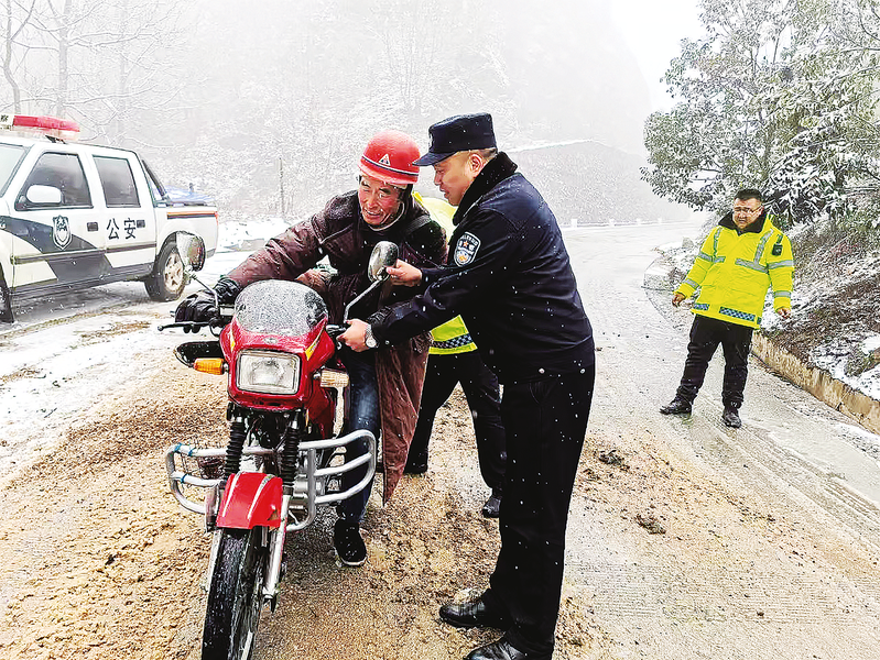 1月24日,柞水縣公安局曹坪派出所所長方偉帶領(lǐng)民輔警在積雪嚴(yán)重的曹坪鎮(zhèn)蔭溝嶺道路執(zhí)勤,及時(shí)攙扶住側(cè)滑的摩托車駕駛員,確保駕駛員人身安全。(本報(bào)通訊員 徐啟煒 攝)