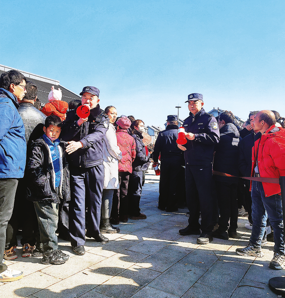 2月3日,洛南縣保安鎮(zhèn)舉辦農(nóng)耕器具民俗風(fēng)情文化惠民演出,保安派出所所長石軍平(左一)與同事喊話執(zhí)勤,現(xiàn)場(chǎng)安保,維護(hù)秩序。(本報(bào)通訊員 胡文娟 攝)