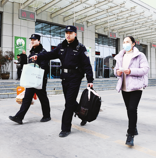 春節(jié)前夕,高新分局丹南派出所民輔警在商洛市汽車客運(yùn)站執(zhí)勤巡邏時(shí)幫助返鄉(xiāng)旅客搬運(yùn)行李。(本報(bào)通訊員 王 丹 攝)