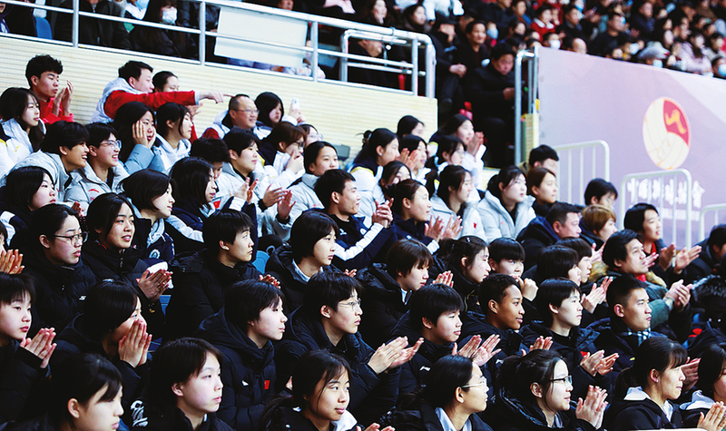 “好球!”“可惜了!”場內(nèi)觀眾熱情高漲,他們?yōu)槊恳淮尉蔬M(jìn)攻和防守歡呼雀躍,也為每一次失誤而扼腕嘆息。隨著比分的交替上升,球場上回蕩著陣陣鼓勁的吶喊聲、掌聲和加油聲,現(xiàn)場氣氛熱烈而又歡快。