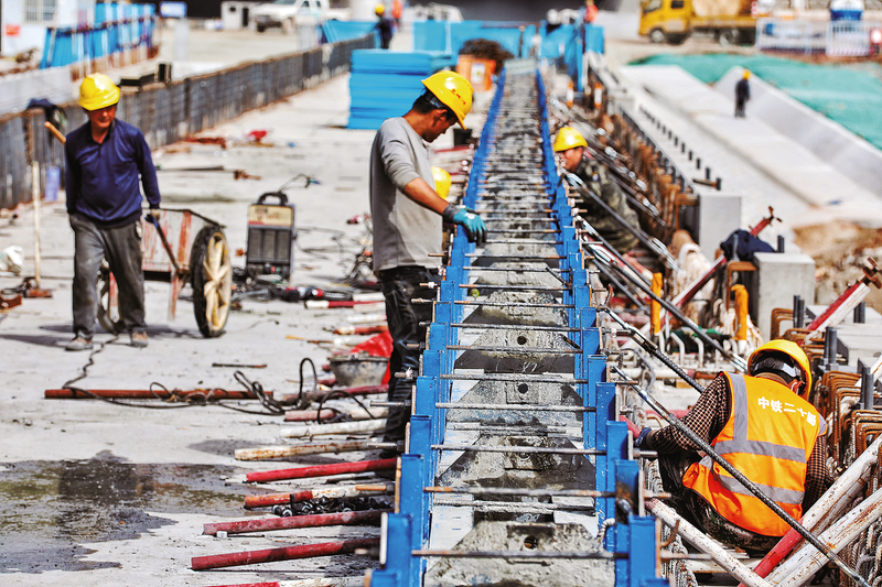 4月16日,工人正在安裝劉家河大橋上的防撞墻預(yù)制模板。