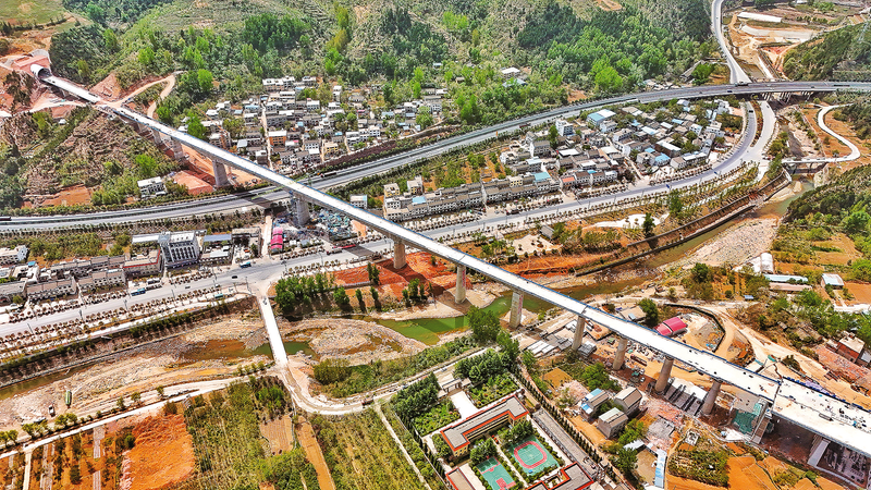 南秦河特大橋是全線唯一一座連跨道(縣、省、國(guó)道,高速公路)、河的特大橋,存在梁部各類預(yù)埋件繁多、鋼筋網(wǎng)密集和安全防護(hù)要求嚴(yán)及施工難度大等難點(diǎn),該橋于2025年1月順利完成橋梁合龍。目前,全體參建者正進(jìn)行橋梁遮板安裝工作。圖為4月16日航拍的南秦河特大橋。