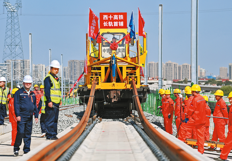 九月八日,在西十高鐵建設(shè)現(xiàn)場西安東至藍田作業(yè)區(qū)間,施工人員將首對五百米長的無縫鋼軌平穩(wěn)鋪設(shè)在無砟軌道板上,標志著由西成客專陜西公司建設(shè)、中鐵四局施工的西十高鐵全線鋪軌正式啟動。西十高鐵西起陜西省西安市,向東南穿越秦嶺山脈,終點為湖北省十堰市,正線全長二百五十五點七六公里,設(shè)計時速三百五十公里。(新華社記者 李一博 攝)