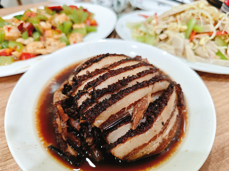 △商洛傳統(tǒng)名菜——商芝肉,承續(xù)商山四皓隱逸文化,精選五花肉與商芝同烹,色澤紅潤、肉質(zhì)軟糯,入口咸香醇厚,盡顯商洛千年飲食風(fēng)韻。