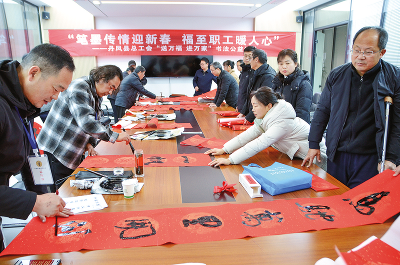 ?2月4日,丹鳳縣總工會在縣工業(yè)園區(qū)開展“筆墨傳情迎新春 福至職工暖人心”書法公益活動。活動現(xiàn)場,縣書法家協(xié)會會員和書法愛好者揮毫潑墨為企業(yè)職工義寫春聯(lián)、福字等,為一線職工送上了新春祝福,營造了濃厚的春節(jié)氛圍。(本報通訊員 楊 威 攝)