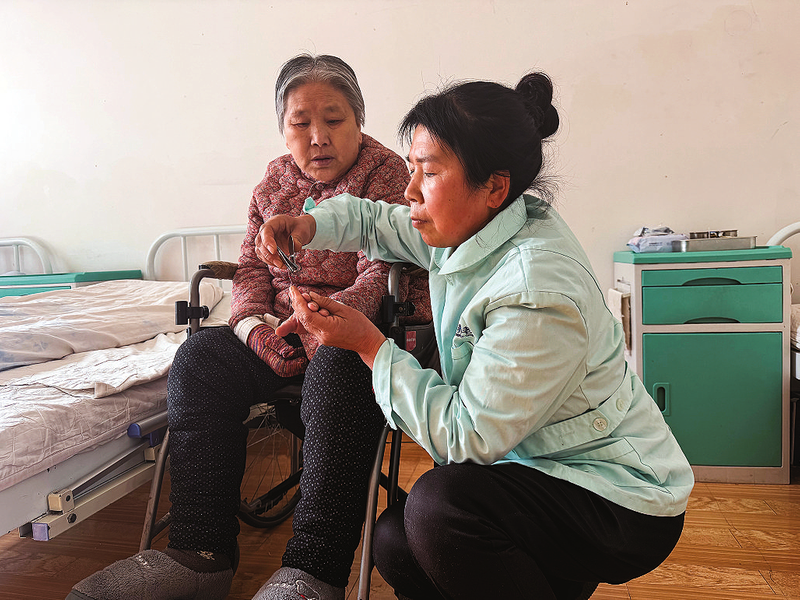 來(lái)不及多寒暄,羅福霞轉(zhuǎn)身走向另一個(gè)房間。床上躺著一位生病的老人,只見(jiàn)她俯身熟練地為其翻身、按摩、擦洗、剪指甲、喂藥,再利落地?fù)Q上干凈床單。整個(gè)過(guò)程行云流水,沒(méi)有多余的話(huà)語(yǔ),只有細(xì)致入微的動(dòng)作。這是羅福霞在這里度過(guò)的第三個(gè)春節(jié)。