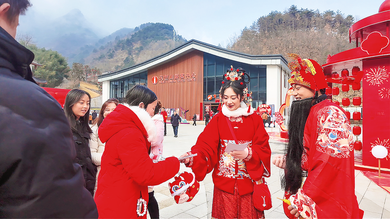 2月21日,在秦嶺天竺山景區(qū)內(nèi),“福祿壽喜財”NPC與游客親切互動,派發(fā)新春祝福。