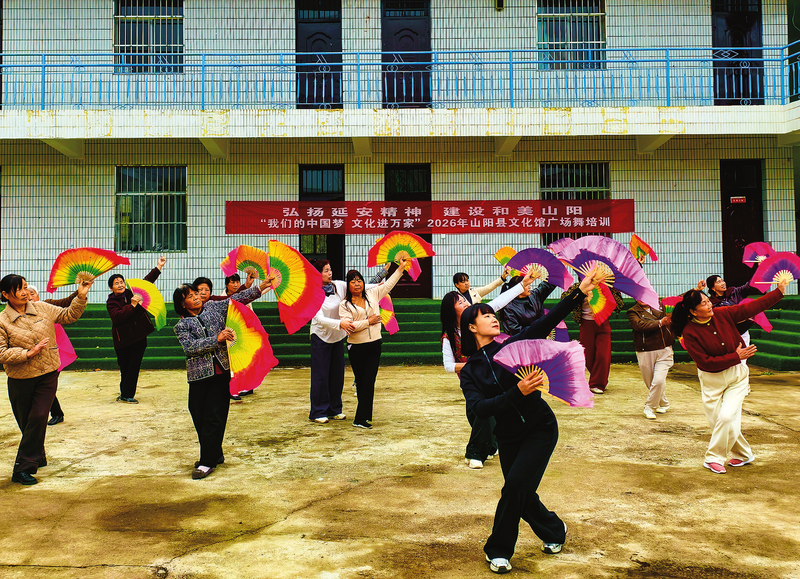 △近日,山陽(yáng)縣文化館先后在十里鋪街道高二社區(qū)、城關(guān)街道張?jiān)鐓^(qū)等地開展“弘揚(yáng)延安精神 建設(shè)和美山陽(yáng)——我們的中國(guó)夢(mèng) 文化進(jìn)萬(wàn)家”廣場(chǎng)舞培訓(xùn)。山陽(yáng)縣文化館選派專業(yè)人員精心為基層舞蹈愛好者進(jìn)行教學(xué)指導(dǎo),以文藝培訓(xùn)傳承延安精神、豐富群眾文化生活。圖為文化館舞蹈培訓(xùn)老師正在高二社區(qū)開展《東方紅》扇子舞培訓(xùn)。(本報(bào)通訊員 王榮金 攝)