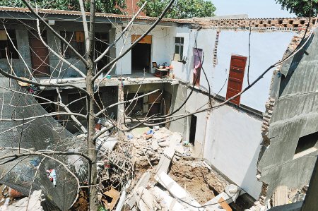 昨日上午,雁塔區(qū)等駕坡街辦月登閣村1組顯得很忙亂。靠近路邊幾戶人家的二層小樓都被警戒線圍了起來,每家大門上都寫著“危 緊急疏散”字樣,大門前堆著行李,有的用紙箱裝著,有的用床單裹著,還有油鹽醬醋瓶子、煤氣罐、鍋碗瓢盆,擺得滿地都是;有的男人扛著箱子,女人抱著孩子邊喊邊指揮,等著三輪車將自己的家當(dāng)拉走。“那邊的房子塌了,這邊也成了危房,不敢住了。”一位租住在這里的婦女告訴記者。像她一樣忙著搬家的還有6戶村民以及數(shù)十戶房客,大約100人。