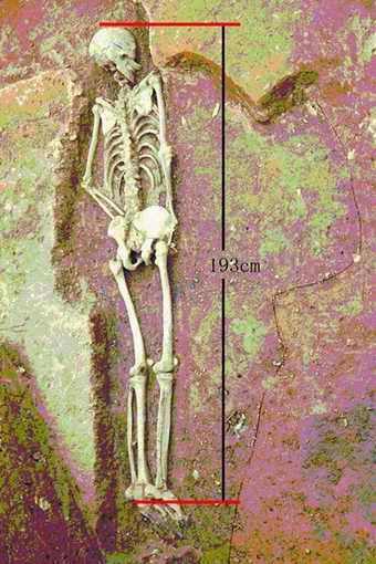 在龍山時代晚期的一個廢棄窖穴里,發(fā)現(xiàn)了一個非常粗壯的人骨遺骸,保存得很完整,考古人員進行測量、拍照。2008年12月,經(jīng)中國科學院地球環(huán)境研究所西安加速器質譜中心測定,確認“小巨人”距今有4200年,應為龍山時代晚期的史前人類。