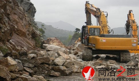 商州區(qū)麻街嶺段發(fā)生山體滑坡,大石塊橫霸路面,現(xiàn)場工作人員緊急對路面進行搶修。