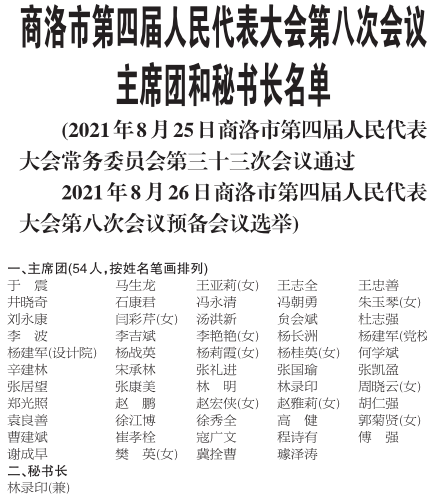 本報(bào)訊(記者 余婷)8月26日下午,商洛市第四屆人民代表大會(huì)第八次會(huì)議主席團(tuán)舉行第二次會(huì)議。大會(huì)主席團(tuán)常務(wù)主席張凱盈主持會(huì)議,主席團(tuán)其他成員出席會(huì)議?! ?huì)議應(yīng)到54人,出席53人,出席人數(shù)符合法定人數(shù)。 ...