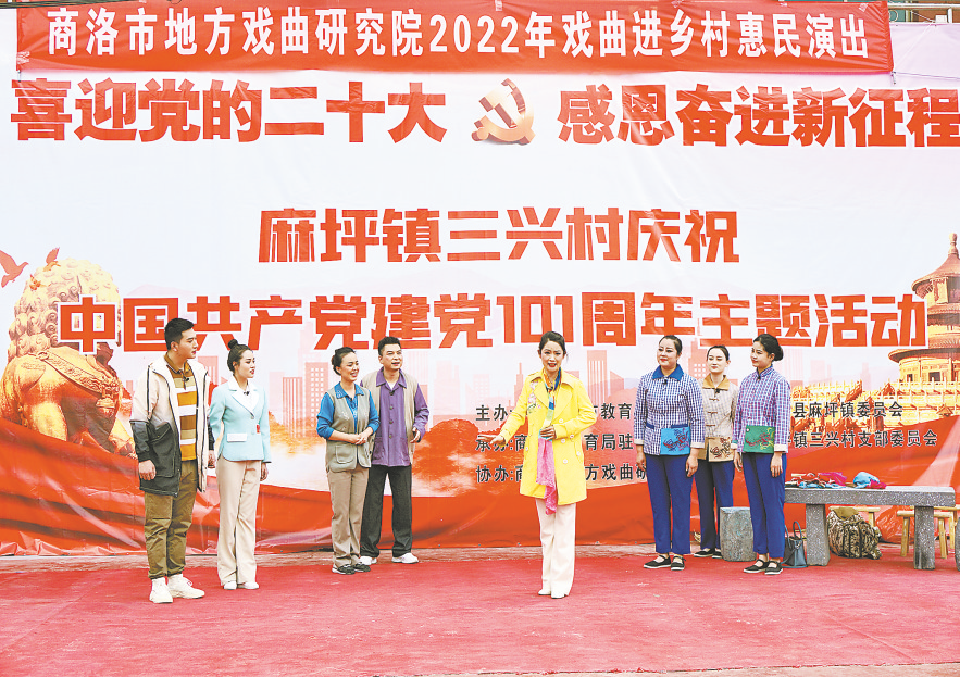 6月29日,市教育局聯(lián)合洛南縣麻坪鎮(zhèn),在三興村舉辦“喜迎黨的二十大·感恩奮進新征程”主題活動,表彰了三興村11名模范黨員,為三興村農(nóng)家書屋和小學(xué)捐贈了價值1.5萬元的圖書,還邀請市戲曲研究院為群眾表演了歌伴舞、秦腔、花鼓小戲等文藝節(jié)目,贏得了大家的陣陣掌聲。 (本報記者 王 倩 攝)