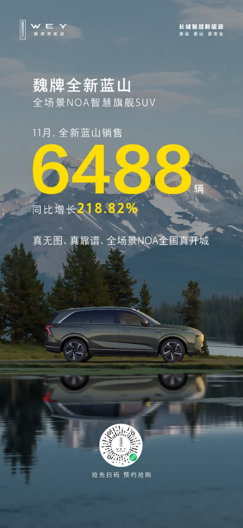 憑借全面卓越的硬核實力,全新藍山以頭部優(yōu)等生的姿態(tài)披荊斬棘,持續(xù)贏得市場與用戶的廣泛認可與信賴,引領了大六座新能源SUV市場的發(fā)展方向。據(jù)最新銷量數(shù)據(jù)顯示,魏牌全新藍山11月銷售6488輛,同比增長218.82%,保持強勁增勢,不斷綻放中國智造高端實力的“魏牌風采”。