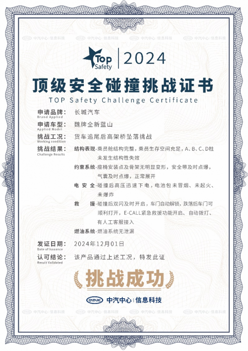 2024年12月2日-4日,在第13個全國交通安全日之際,作為長城汽車旗下高端新能源品牌,魏牌攜手中汽中心TOP Safety開展了一場難度極大的“行業(yè)首個高架橋墜落挑戰(zhàn)”。作為此次挑戰(zhàn)的主角,魏牌全新藍山以卓越的整車、電池、主被動、智駕等安全性能,成功通過這一極限測試,再次印證了其在安全領域的強勁實力和領先地位。