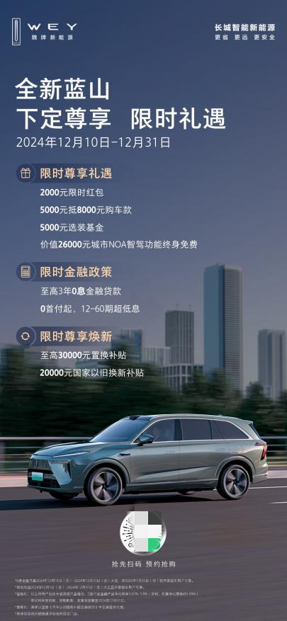 而全新藍(lán)山限時(shí)尊享購(gòu)車禮遇可謂一目了然:2000元限時(shí)紅包直接送上,5000元抵8000元購(gòu)車款為預(yù)算減負(fù);5000元選裝基金與價(jià)值26000元的城市NOA智駕功能終身免費(fèi),真正把高端智能體驗(yàn)裝進(jìn)日常。靈活的金融政策更是直接將購(gòu)車壓力降到最低,至高3年0息金融貸款,首付0元起,最長(zhǎng)60期的超低息方案為你的購(gòu)車計(jì)劃加持從容。此外,換購(gòu)車主還可享受至高30000元的置換補(bǔ)貼、20000元的國(guó)補(bǔ)煥新政策,讓升級(jí)煥新輕松加倍。在魏牌全新藍(lán)山的世界里,購(gòu)車不再是復(fù)雜的“心理戰(zhàn)”,而是一次愉悅且安心的開(kāi)始。