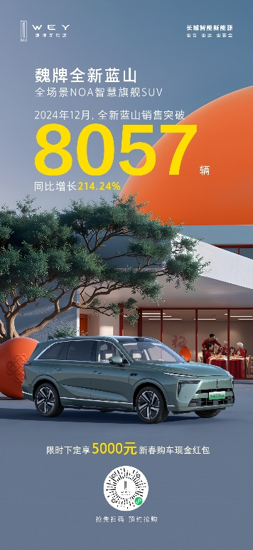 自上市以來,魏牌全新藍(lán)山銷量持續(xù)突破,連續(xù)四個(gè)月銷量突破6000輛以上,12月銷量再創(chuàng)新高勁銷8057輛,成為30萬級(jí)全場(chǎng)景NOA智慧旗艦SUV不二之選。魏牌全新藍(lán)山勢(shì)不可擋的銷量增長(zhǎng),充分展現(xiàn)了市場(chǎng)對(duì)其的熱烈追捧和高度認(rèn)可,也讓我們對(duì)魏牌全新藍(lán)山銷量破萬充滿了期待。