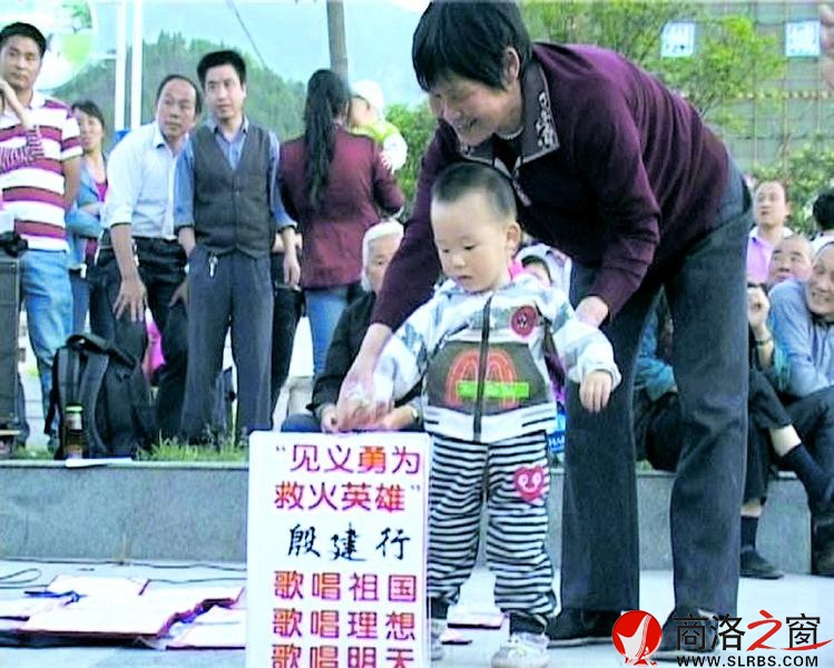 他先后到西安、漢中、南京、杭州等地“游唱”,一場、兩場……,一角、五角、一元……;他一邊走一邊唱,短短幾十天時間,殷建行便將義唱募捐得來的2萬多元全部捐給了地震災區(qū)。在四川成都的一次募捐演唱中,有觀眾當場撥打“110”,說他假賣唱騙錢,警察驗看了他的身份證和在不同地點的捐款證明、票據(jù)和十幾本證書后深受感動,對他的事跡進行了肯定和表揚。在成都期間,他得知青羊區(qū)一個叫沉勇棋的小朋友玩煙花時將全身85%燒傷,家里無力支付醫(yī)療費時,經(jīng)歷過同樣切膚之痛的殷建行當即決定為小勇棋義演募捐。為了早日湊齊手術(shù)費,他連續(xù)兩個晚上演唱到12點,唱到動情處竟淚流滿面,圍觀的群眾深深地被他感動了,紛紛伸出援助之手。在他的感召下,當?shù)氐膶W校、機關(guān)單位紛紛為小勇棋捐款,很快就湊齊了高額的醫(yī)療費,小勇棋植皮手術(shù)得以順利實施。