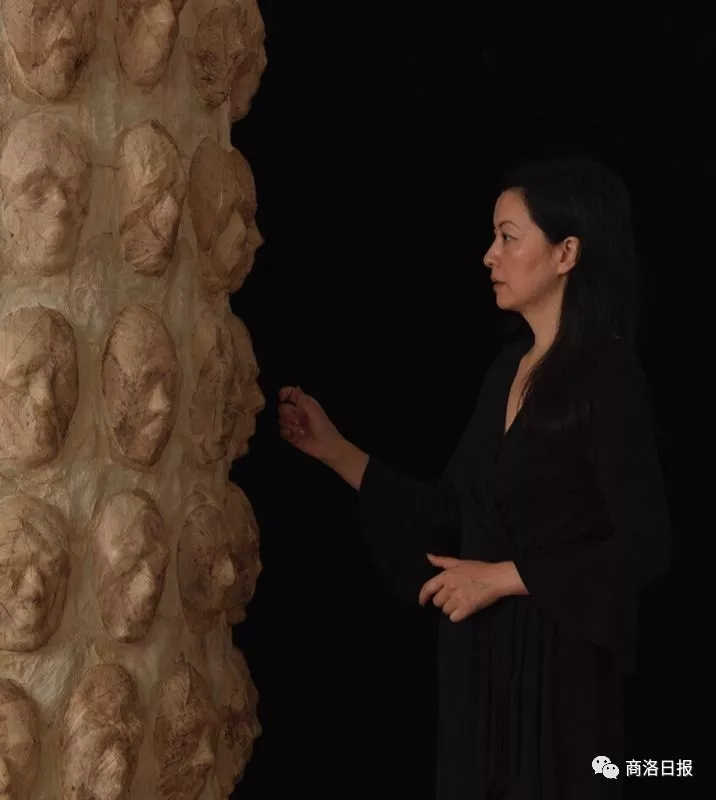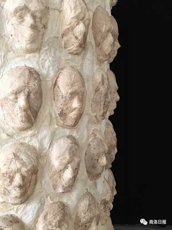 郭燕接受本報新媒體記者采訪時介紹,兩件裝置作品都用原生木漿紙和網(wǎng)狀的樹葉做成,一件由180張“人”的面孔組成的叫《眾生》,另外一件由133張面孔組成的兩米高的圓柱狀作品取名《輪回》,前后花了4個月時間。