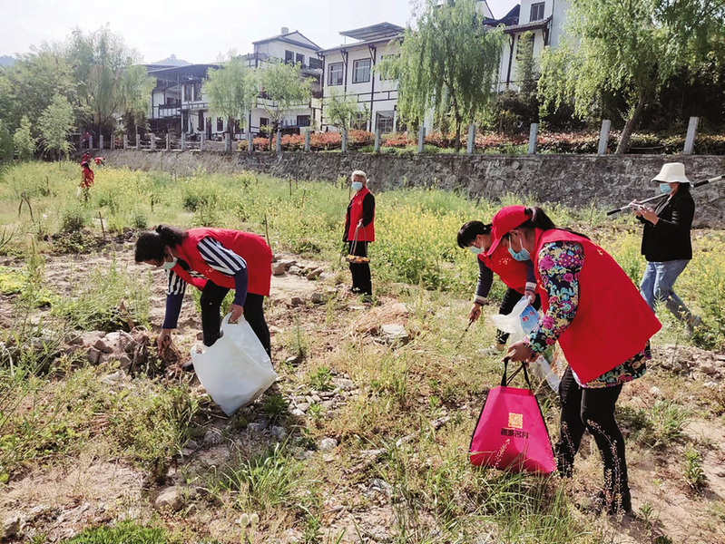 竹林關(guān)村志愿者在河道撿拾垃圾