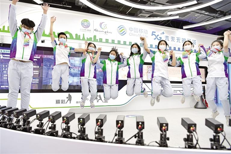 8月13日, 在十四運(yùn)會(huì)賽事指揮和新聞媒體中心,一款由72臺(tái)相機(jī)組成、可從多個(gè)角度拍攝運(yùn)動(dòng)場(chǎng)景的5G+AI相機(jī),受到體驗(yàn)者喜愛。 記者 杜瑋攝