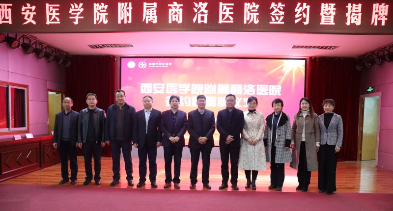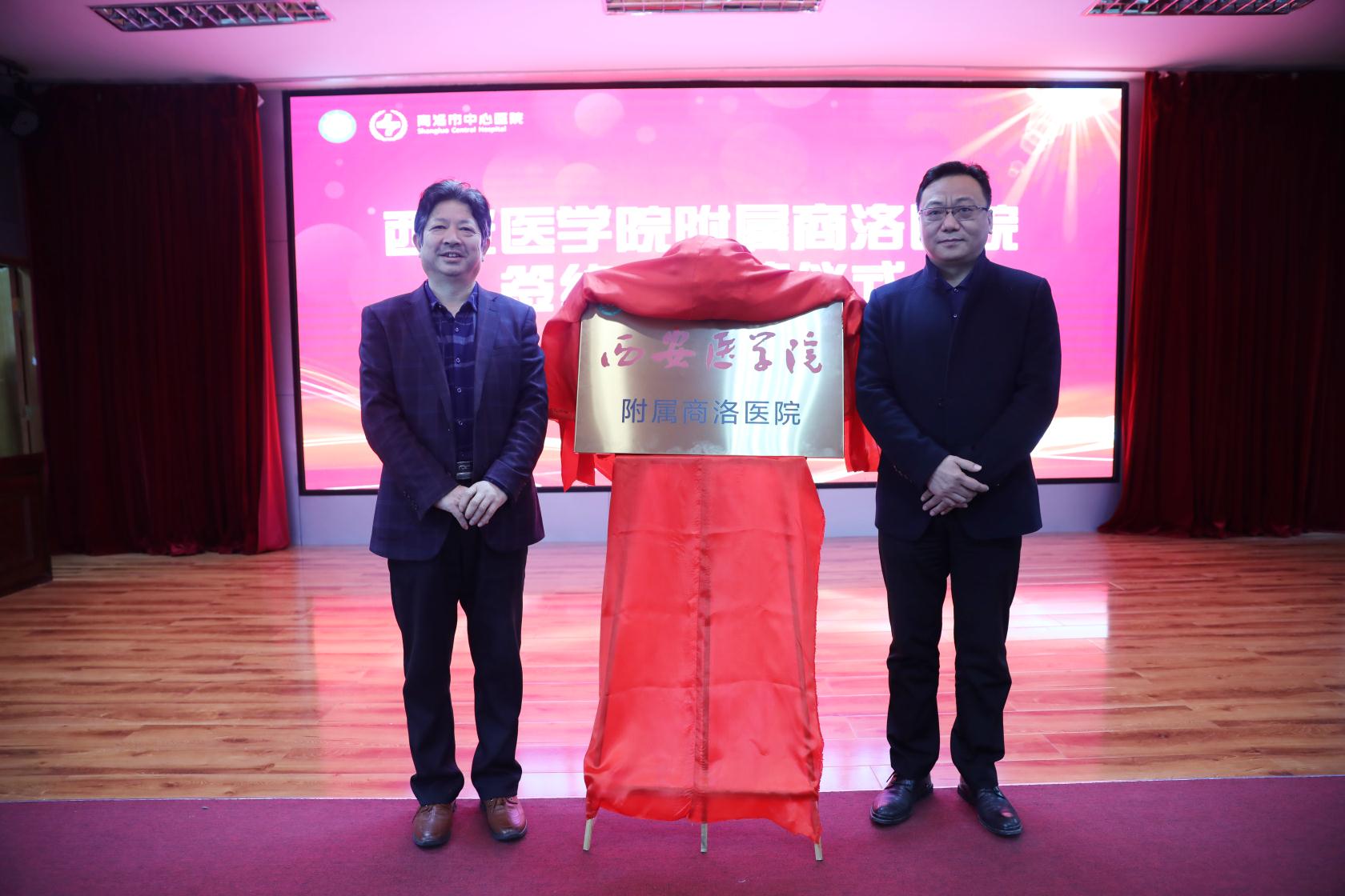 在與會領導的共同見證下,李斌、朋雙成分別代表雙方單位簽訂了合作協(xié)議。李斌、郝玉鋒共同為“西安醫(yī)學院附屬商洛醫(yī)院”揭牌。