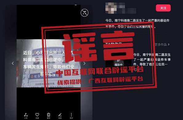 真相:近期,有網(wǎng)民在短視頻平臺(tái)上發(fā)布視頻稱“某派出所三人在路口巡邏中,突然車輛發(fā)生爆炸,導(dǎo)致三位民警全部犧牲”。經(jīng)南寧公安部門調(diào)查,該信息為謠言。網(wǎng)民韋某為吸引關(guān)注,杜撰此條謠言信息,并利用手機(jī)進(jìn)行發(fā)布。根據(jù)《中華人民共和國(guó)治安管理處罰法》第二十五條,屬地公安機(jī)關(guān)已依法對(duì)韋某處以行政處罰。(來(lái)源:廣西互聯(lián)網(wǎng)辟謠平臺(tái)、南寧網(wǎng)警)