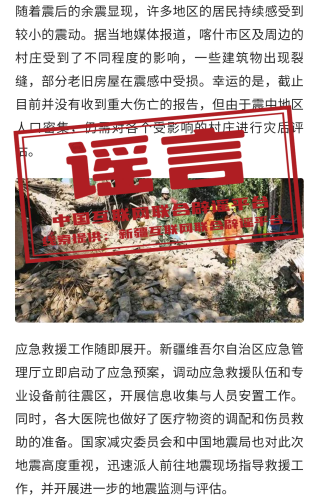 真相:近日,有網民發(fā)布帖文稱“新疆喀什市7月22日發(fā)生6.3級地震,周邊村莊建筑出現(xiàn)裂痕,部分老舊房屋在震感中受損……”。經新疆喀什市應急管理局證實,當日喀什市域內未發(fā)生地震,中國地震臺網也未發(fā)布喀什當日發(fā)生地震的相關信息,此信息為虛假內容。(來源:網信新疆、新疆喀什網絡舉報)