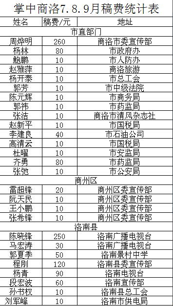 掌中商洛訊 掌中商洛自6月底上線以來,得到社會各界的廣泛關(guān)注,特別是得到廣大通訊員的大力支持。三個月來,共收到社會來稿300余篇,其中從中選用編發(fā)稿件230篇?,F(xiàn)將編發(fā)的稿件作者姓名、單位,發(fā)稿篇數(shù)等情況予以公布。請市直部門自公布之日起,本人持有效證件到商洛日報社辦公樓503號領(lǐng)取。七縣區(qū)的稿費,由各縣區(qū)宣傳部指定人員來報社新媒體部代領(lǐng),再按相關(guān)人員分別發(fā)放。聯(lián)系電話:2395887。附用稿情況詳單: