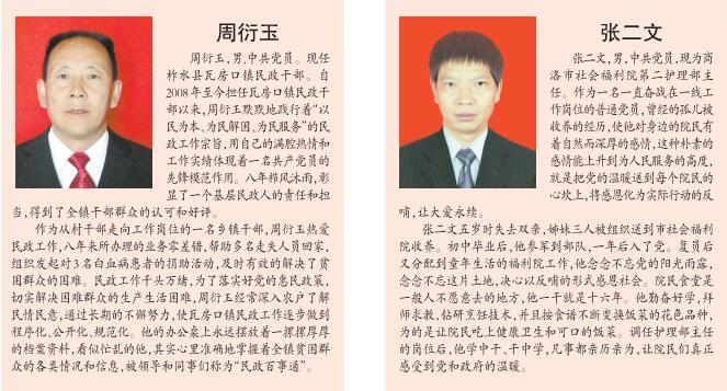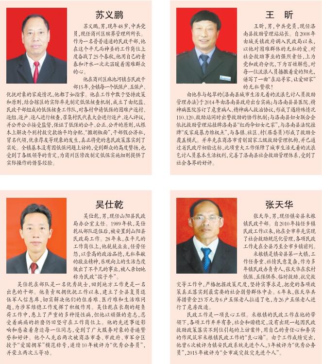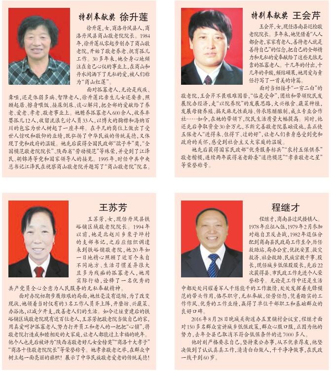 為了大力宣傳長(zhǎng)期在基層默默奉獻(xiàn)的先進(jìn)民政工作者,充分展示商洛民政工作者的良好形象,促進(jìn)全市民政工作再上新臺(tái)階,本報(bào)將此次獲得“最美民政人特別奉獻(xiàn)獎(jiǎng)”和“最美民政人”共計(jì)12人的先進(jìn)事跡予以刊登,希望全市民政系統(tǒng)迅速掀起學(xué)習(xí)先進(jìn)、追趕先進(jìn)、超越先進(jìn)的熱潮,進(jìn)一步宣傳、學(xué)習(xí)他們的崇高品質(zhì),弘揚(yáng)他們的奉獻(xiàn)精神,傳承他們的優(yōu)良作風(fēng),擔(dān)當(dāng)負(fù)責(zé),開拓創(chuàng)新,積極投身全市“五大攻堅(jiān)戰(zhàn),全力做好各項(xiàng)民政工作,為建設(shè)創(chuàng)新美麗幸福商洛作出新的更大的貢獻(xiàn)!