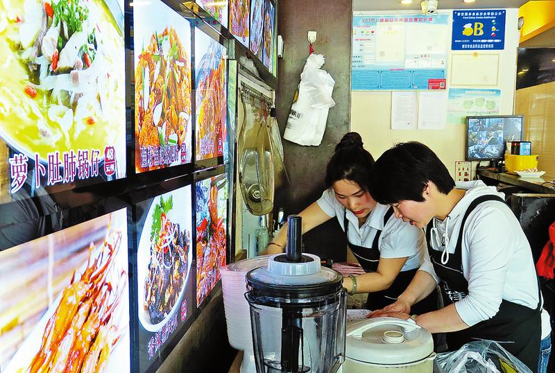 梅曉靜(右)忙著分外賣單。因為菜品富有特色,外賣訂單量十分可觀。(5月3日攝)