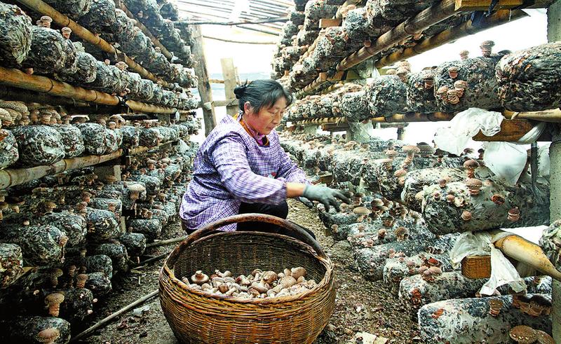 在桑樹村的香菇種植基地里,村民們正在忙著采摘、搬運(yùn)香菇。在村民潘紅英家的香菇棚里,只見她麻利地把菌棒上一個個肥厚的香菇摘入籃中,不一會兒就摘了一籃子。