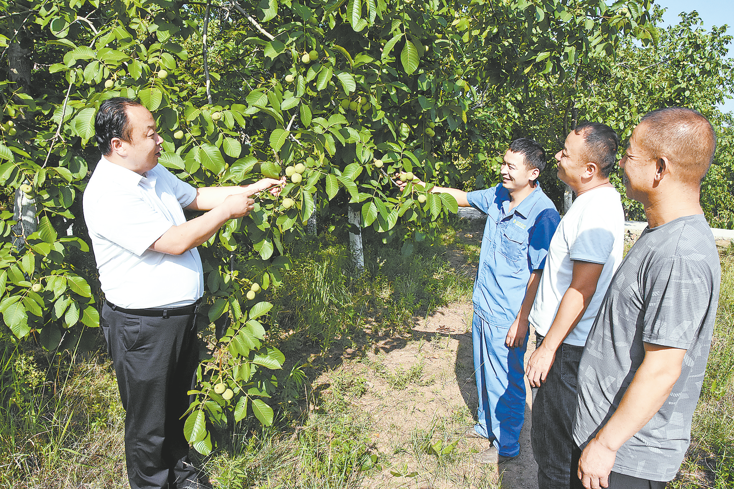 陳坤(左一)在查看今年核桃長(zhǎng)勢(shì)