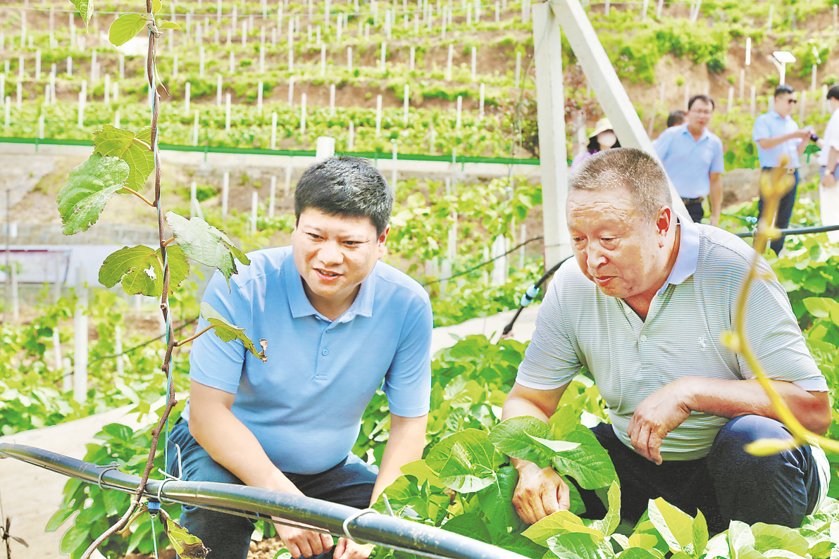 雨花臺區(qū)對口幫扶丹鳳縣聯絡組組長、丹鳳縣委常委、副縣長薛偉在狝猴桃種植園查看狝猴桃生長情況。