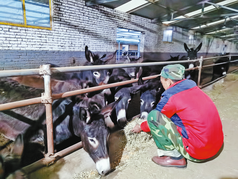 脫貧戶嚴(yán)書軍在家門口的綠東夢牧業(yè)驢場負(fù)責(zé)飼養(yǎng)驢,每月有固定的收入。 (本報(bào)通訊員 劉阿楠 攝)