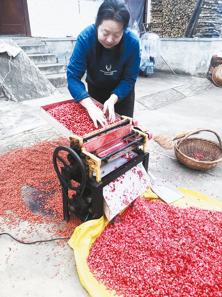丹鳳縣惠南種植專業(yè)合作社工作人員說(shuō):“今年山茱萸豐收了,顆大肉厚、色澤鮮亮,我們從10月初就多方籌資30萬(wàn)元開(kāi)始收購(gòu)山茱萸。投資7000多元購(gòu)買了4臺(tái)山茱萸去核機(jī),合作社每天收購(gòu)加工鮮山茱萸果5噸多,然后將山茱萸粗加工后發(fā)往安徽亳州中藥材市場(chǎng)。”