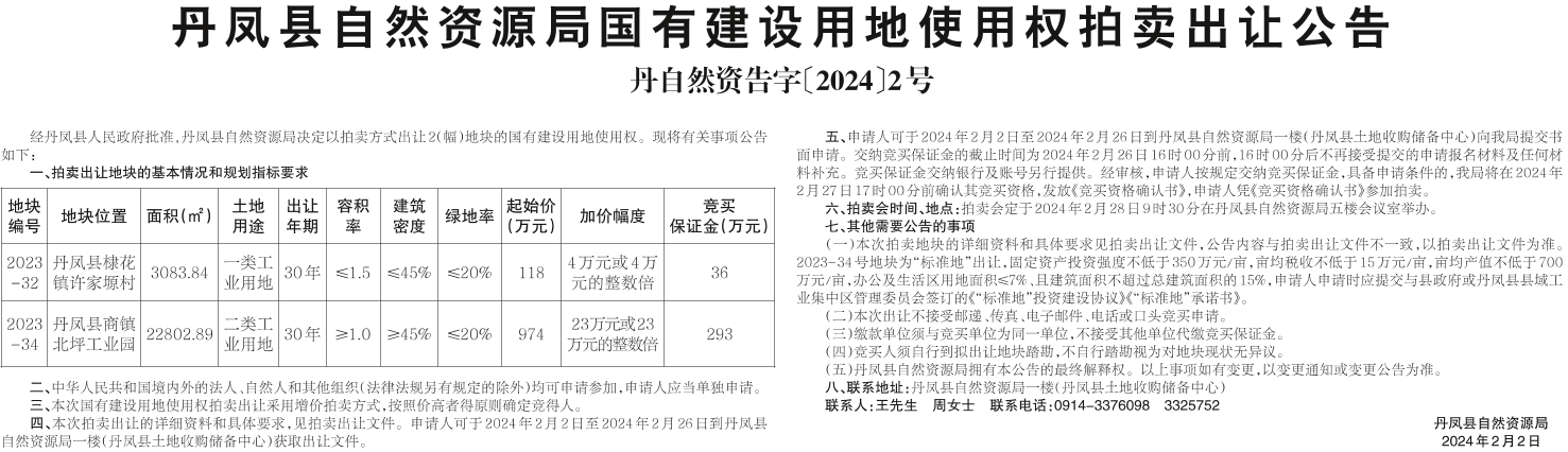 丹鳳縣自然資源局國(guó)有建設(shè)用地使用權(quán)拍賣出讓公告