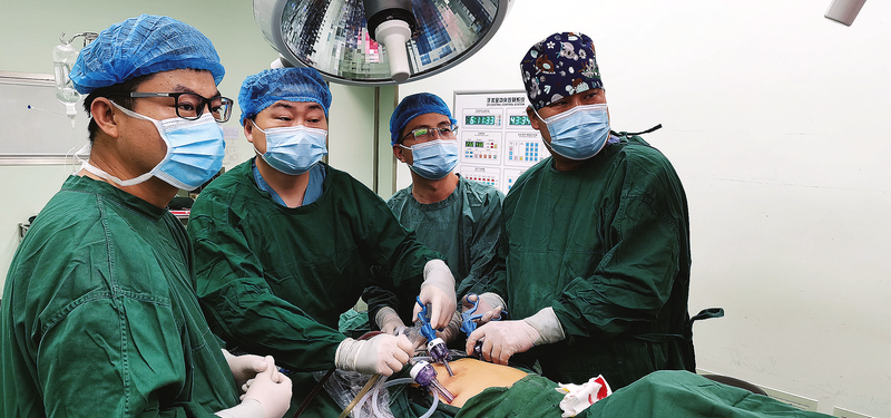 南京市第一醫(yī)院楊維軍醫(yī)生(左二)帶領(lǐng)普外科醫(yī)生進(jìn)行腹腔鏡脾切除術(shù)