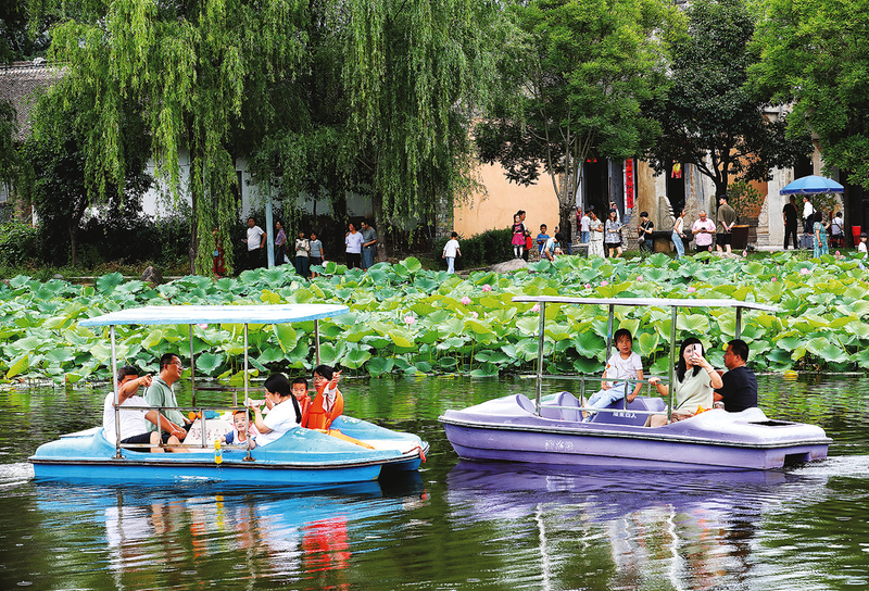 每年夏天,荷花盛開(kāi)之時(shí),棣花千畝荷塘便成為眾多市民游客爭(zhēng)相打卡之地,游客們或站在荷塘邊、或坐在涼亭中,靜靜地欣賞著這夏日的美景。微風(fēng)四起,荷香四溢,清涼感也隨之而來(lái)。又或者,乘一只小船,泛舟荷塘中,花映游人面,人在荷中游,別有一番詩(shī)情畫意。小船蕩漾在荷塘中,讓荷塘多了一份靈動(dòng),荷塘畔觀花的人在岸上看水中穿梭的小船,小船也成了別人眼中別樣的風(fēng)景。