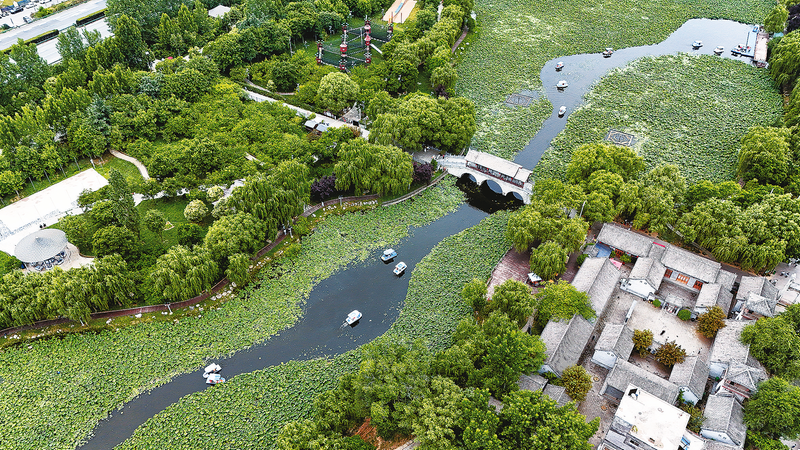 風(fēng)雨橋下荷葉涌動(dòng),游人橋上橋下穿梭其中。