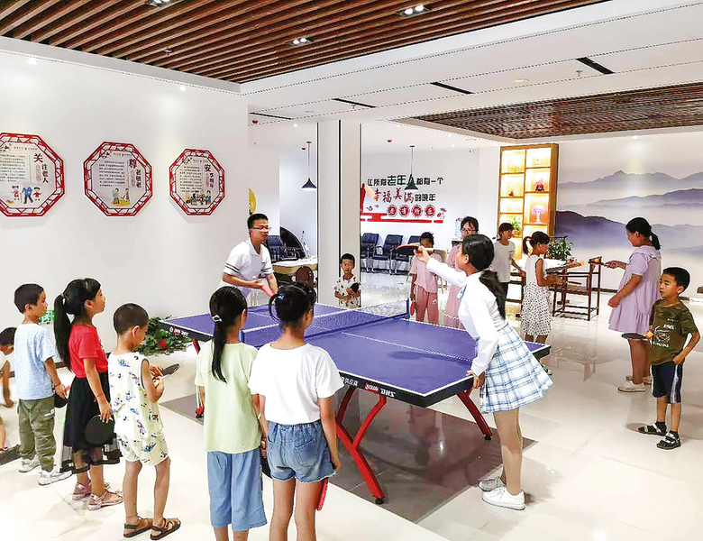 周末,孩子們在社區(qū)體育活動室打乒乓球。