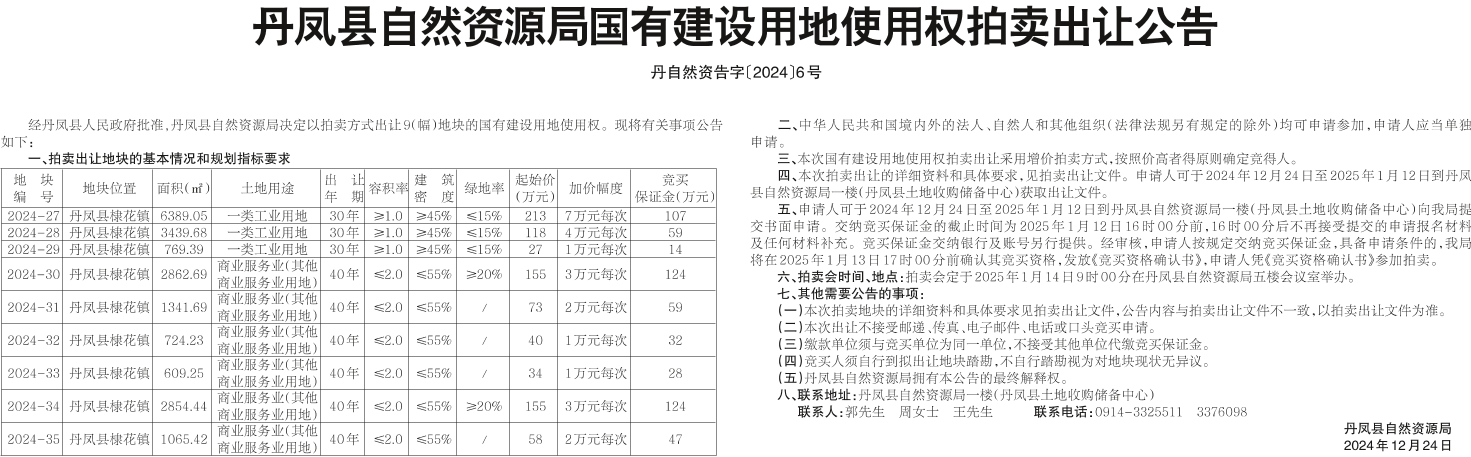 丹鳳縣自然資源局國有建設(shè)用地使用權(quán)拍賣出讓公告
