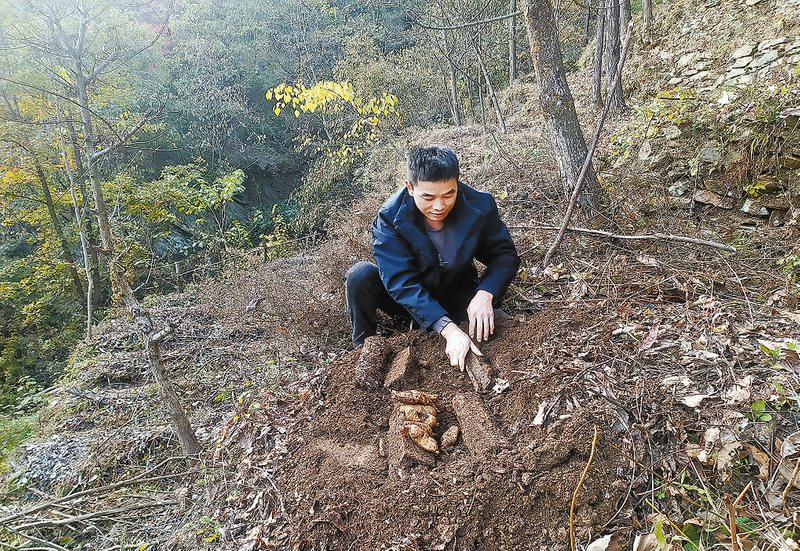 2024年12月24日,記者跟著天麻種植戶(hù)呂江軍一路上山,羊腸小道上落滿(mǎn)了櫟樹(shù)、槲樹(shù)的葉子,踩上去發(fā)出“沙沙”聲,在靜寂的山間響起了回聲。爬上龍王廟村呂家山組高高的山嶺,幾面山坡上的石坎地里,鋪滿(mǎn)了樹(shù)葉和草。呂江軍蹲下身,扒開(kāi)地面上覆蓋的干草和樹(shù)葉,用一截樹(shù)枝拋開(kāi)土,拉出一截椴木,泥土里面露出了白生生的天麻。他刨出一個(gè)大點(diǎn)的天麻,高興地說(shuō):“這一茬天麻有10來(lái)畝,長(zhǎng)勢(shì)很好,今冬采收了,能賣(mài)10多萬(wàn)元。我回來(lái)搞天麻這個(gè)路子走對(duì)了。”