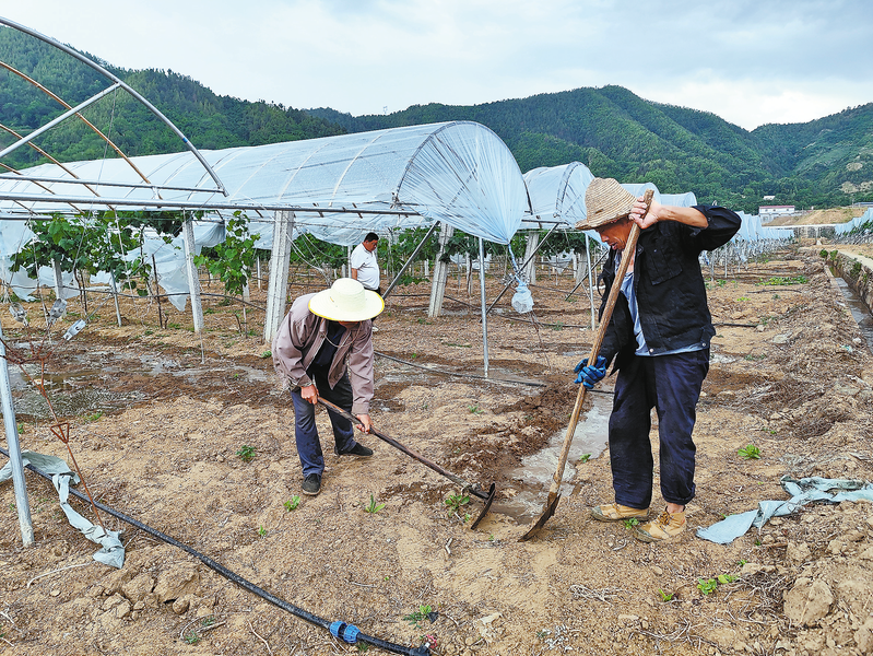 連日來,丹鳳縣土門鎮(zhèn)土門村組織群眾引水澆灌葡萄園。為做好糧食安全和水雜果園區(qū)抗旱管理,鎮(zhèn)上對產(chǎn)業(yè)園區(qū)采用“一園區(qū)一抗旱”方案,利用原有噴灌、滴灌設(shè)施有效保障土門糧食種植示范田、獼猴桃基地、葡萄基地、長沙溝口村葡萄基地和大棚以及七星溝村大棚、八十河村糧食種植示范田灌溉用水。(本報(bào)記者 賈書章 攝)