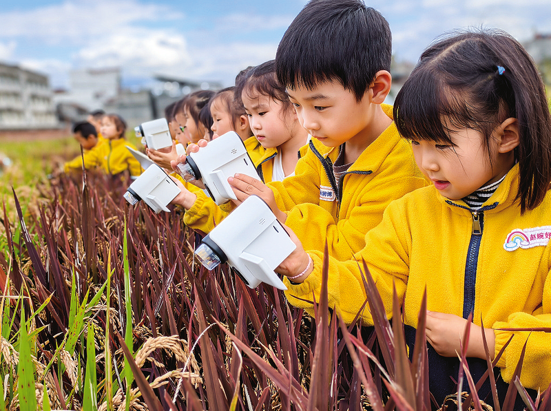 在金色的稻田里,孩子們興致勃勃地觀察飽滿的稻穗,用放大鏡探索稻粒的奧秘,親手收集稻種,沉浸式感受“汗滴禾下土”的辛勞。農(nóng)技人員現(xiàn)場生動講解旱稻種植知識,帶領(lǐng)孩子們認識稻谷的生長過程,讓他們在實踐中領(lǐng)悟農(nóng)耕文化的深厚內(nèi)涵。