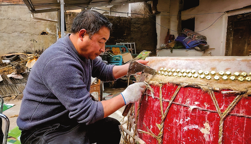 用老槐樹做的鼓破損嚴(yán)重,李剛在院子里翻新它。