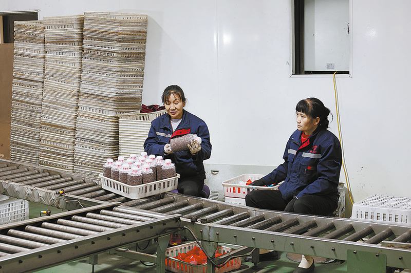 工人在丹鳳縣永福工貿(mào)有限責(zé)任公司車間分裝菌材。