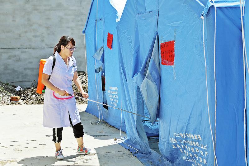8 月 10 日,鎮(zhèn)衛(wèi)生院醫(yī)務(wù)人員對(duì)安置點(diǎn)進(jìn)行消毒。